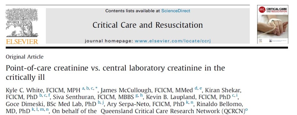 Reference: White, K. C., McCullough, J., Shekar, K., Senthuran, S., Laupland, K. B., Dimeski, G., Serpa-Neto, A., & Bellomo, R. (2024). Point-of-care creatinine vs. central laboratory creatinine in the critically ill. Critical Care and Resuscitation.