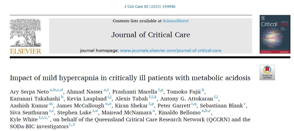 Serpa Neto, A., Nasser, A., Marella, P., Fujii, T., Takahashi, K., Laupland, K., Tabah, A., Attokaran, A. G., Kumar, A., McCullough, J., Shekar, K., Garrett, P., Blank, S., Senthuran, S., Luke, S., McNamara, M., Bellomo, R., & White, K. (2025). Impact of mild hypercapnia in critically ill patients with metabolic acidosis. Journal of Critical Care, 85, 154936.