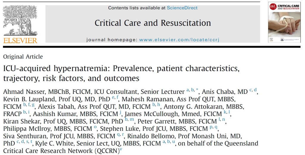 Nasser, A., Chaba, A., Laupland, K. B., Ramanan, M., Tabah, A., Attokaran, A. G., Kumar, A., McCullough, J., Shekar, K., Garrett, P., McIlroy, P., Luke, S., Senthuran, S., Bellomo, R., White, K. C., Ramanan, M., Marella, P., Young, P., McIlroy, P., . . . Keogh, S. (2024). ICU-acquired hypernatremia: Prevalence, patient characteristics, trajectory, risk factors, and outcomes. Critical Care and Resuscitation.